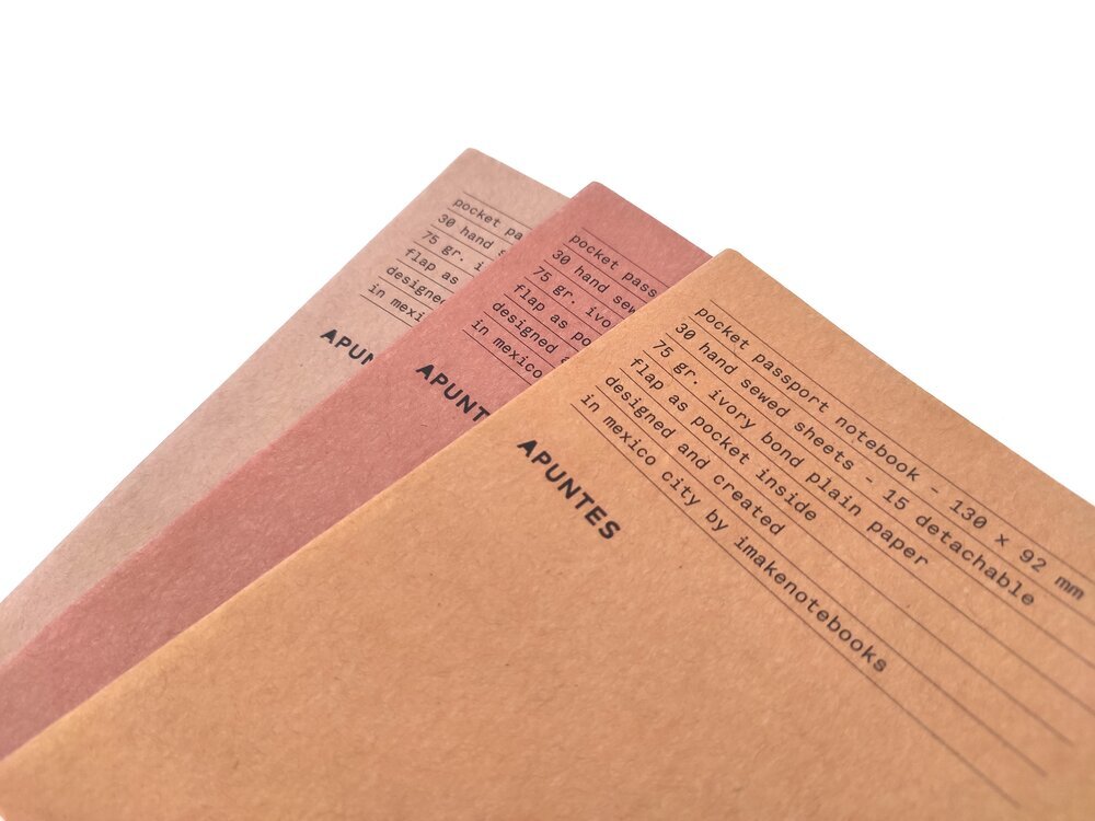 3 pack of mini softcover notebooks handcrafted in Mexico City by Apuntes bookbinding studio. Each notebook is contains 60 pages of unlined ivory paper, a small inside pocket, and half of the pages are detachable. Each set includes three different, natural warm tone notebooks. Their size and soft cover make them ideal for keeping in your pocket to jot down ideas and lists on the fly.